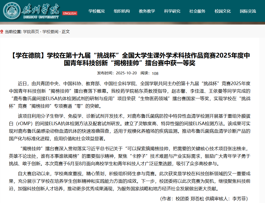 近日,由共青团中央、中国科协、教育部、中国社会科学院、全国学联共同主办的第十九届“挑战杯”竞赛2025年度中国青年科技创新“揭榜挂帅”擂台赛落下帷幕。bbin游戏网站大全官网bbin游戏网站大全官网杨东英教授指导,赵志馨、李佳滋、王依曼等同学完成的“鹿布鲁氏菌间接ELISA抗体检测试剂的研制与应用”项目荣获“生物医药领域”擂台赛国家一等奖,实现学校在“挑战杯”竞赛“揭榜挂帅”专项赛道“零”的突破。