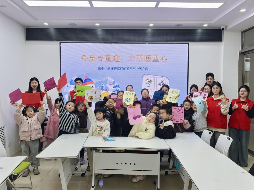 志愿者紧扣冬至养生传统,通过实物展示、趣味动画等生动形式,向孩子们科普生姜、红枣等冬季常见本草食材的特性、功效及家常应用技巧,并设置互动问答,充分调动孩子们的参与热情,现场氛围热烈融洽。在主题绘画环节,志愿者提供融入本草元素的绘画模板,耐心指导孩子们发挥想象,将所学本草知识融入创作,诞生了“本草养生汤圆”“团圆水饺宴”等诸多充满童趣的作品。活动尾声,孩子们集中展示作品,组成“本草冬至童趣展”。