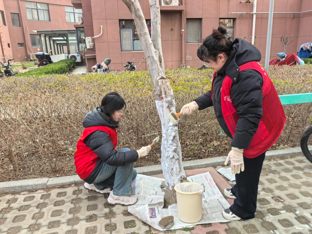 活动当天,社区工作人员详细讲解树木涂白的杀菌防虫、防寒防裂作用,演示操作技巧与标准高度。志愿者们与社区工作者两两组队,观摩学习后迅速投入工作,现场氛围热烈。志愿者们分工协作,清理树干杂物、均匀涂刷涂白剂,重点填补树皮裂缝。经过努力,一排排树干穿上“白色防护衣”,成为社区美景。劳动间隙,志愿者与居民交流护绿心得,增强了家园归属感。
